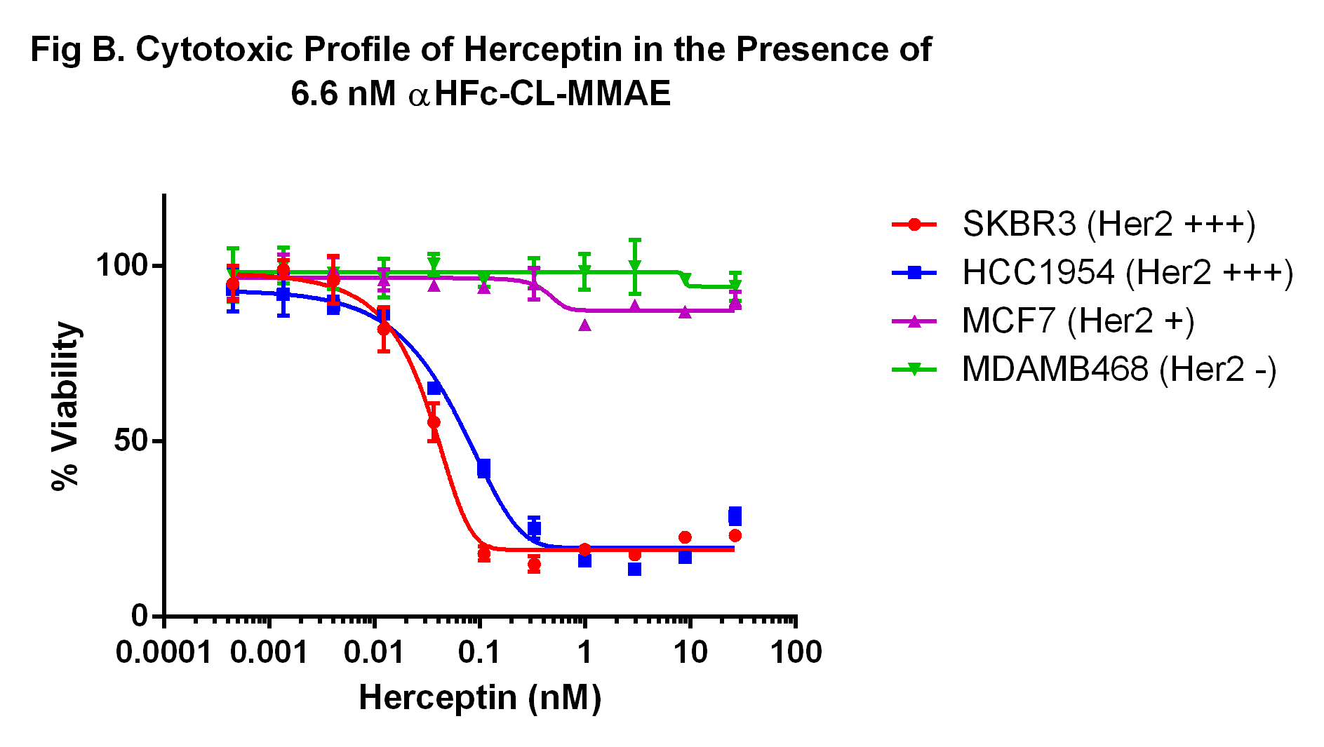 αHFc-CL-MMAE is anti-human IgG Fc specific antibody conjugated to monomethyl auristatin E (MMAE) with a cleavable linker. The antibody portion is a polyclonal antibody which is specific to the Fc region of human IgGs. Monomethyl auristatin E (MMAE) is a cytotoxic small molecule which inhibits cell division by blocking the polymerization of tubulin. The cleavable linker connecting MMAE to the antibody is stable in extracellular fluid, but is cleaved by cathepsin in endosome once the conjugate has entered a cell via endocytosis.
