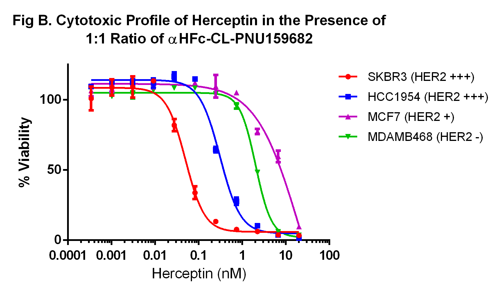 αHFc-CL-PNU is anti-human IgG Fc specific antibody conjugated to PNU-159268 with a cleavable linker. The antibody portion is a polyclonal antibody which is specific to the Fc region of human IgGs. PNU-159682, a derivative of nemorubicin, is a cytotoxic small molecule which causes cell death by intercalating DNA and inhibiting replication. The cleavable linker connecting PNU-159682 to the antibody is stable in extracellular fluid, but is cleaved by cathepsin in endosome once the conjugate has entered a cell via endocytosis.