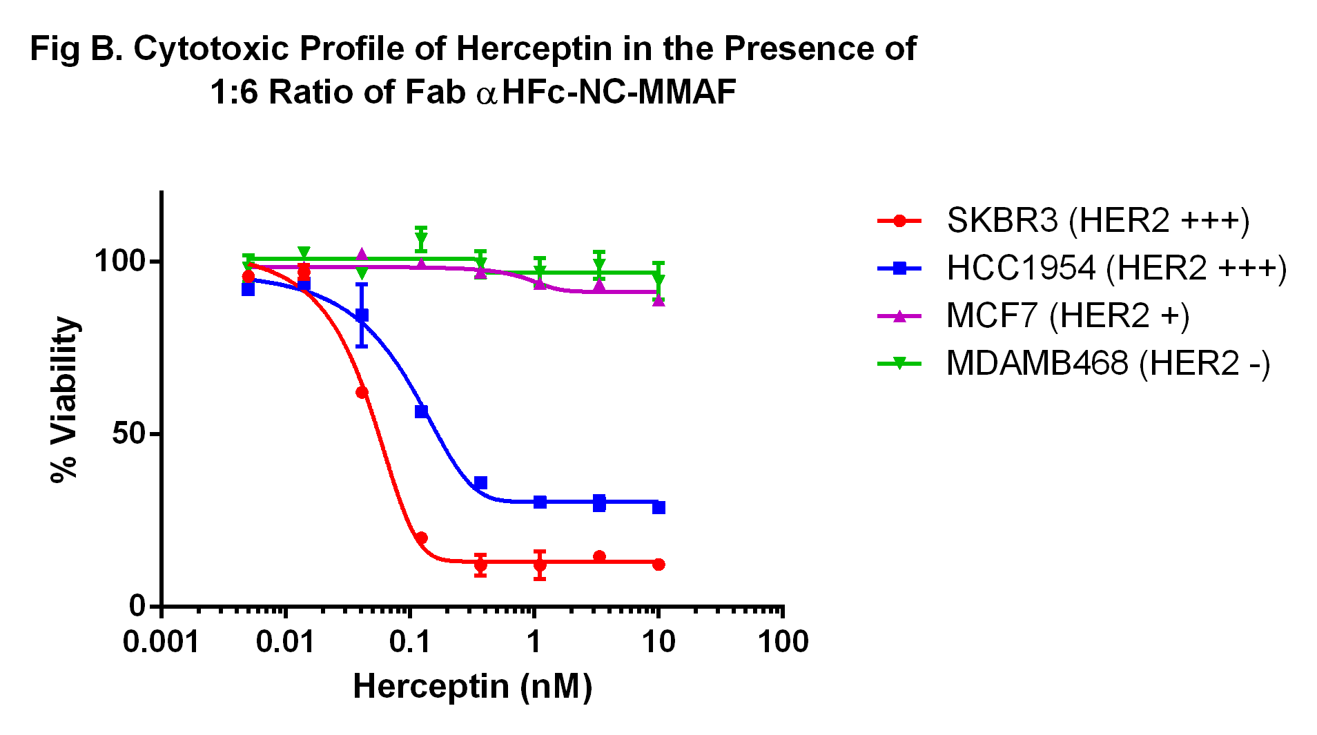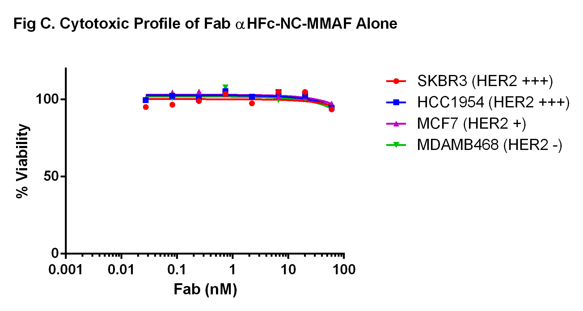 Fab-αHFc-NC-MMAF is a Fab fragment of anti-human IgG Fc specific antibody conjugated to monomethyl auristatin F (MMAF) with a non-cleavable linker. The antibody portion is a polyclonal antibody Fab fragment specific to the Fc region of human IgGs. Monomethyl auristatin F (MMAF) is a cytotoxic small molecule which inhibits cell division by blocking the polymerization of tubulin. The non-cleavable linker connecting MMAF to the antibody is stable in extracellular fluid, but can be cleaved by unspecified mechanisms upon entering cells. The mono-valence nature of Fab 2°ADC may have some advantage in certain applications than the full length IgG 2°ADC.