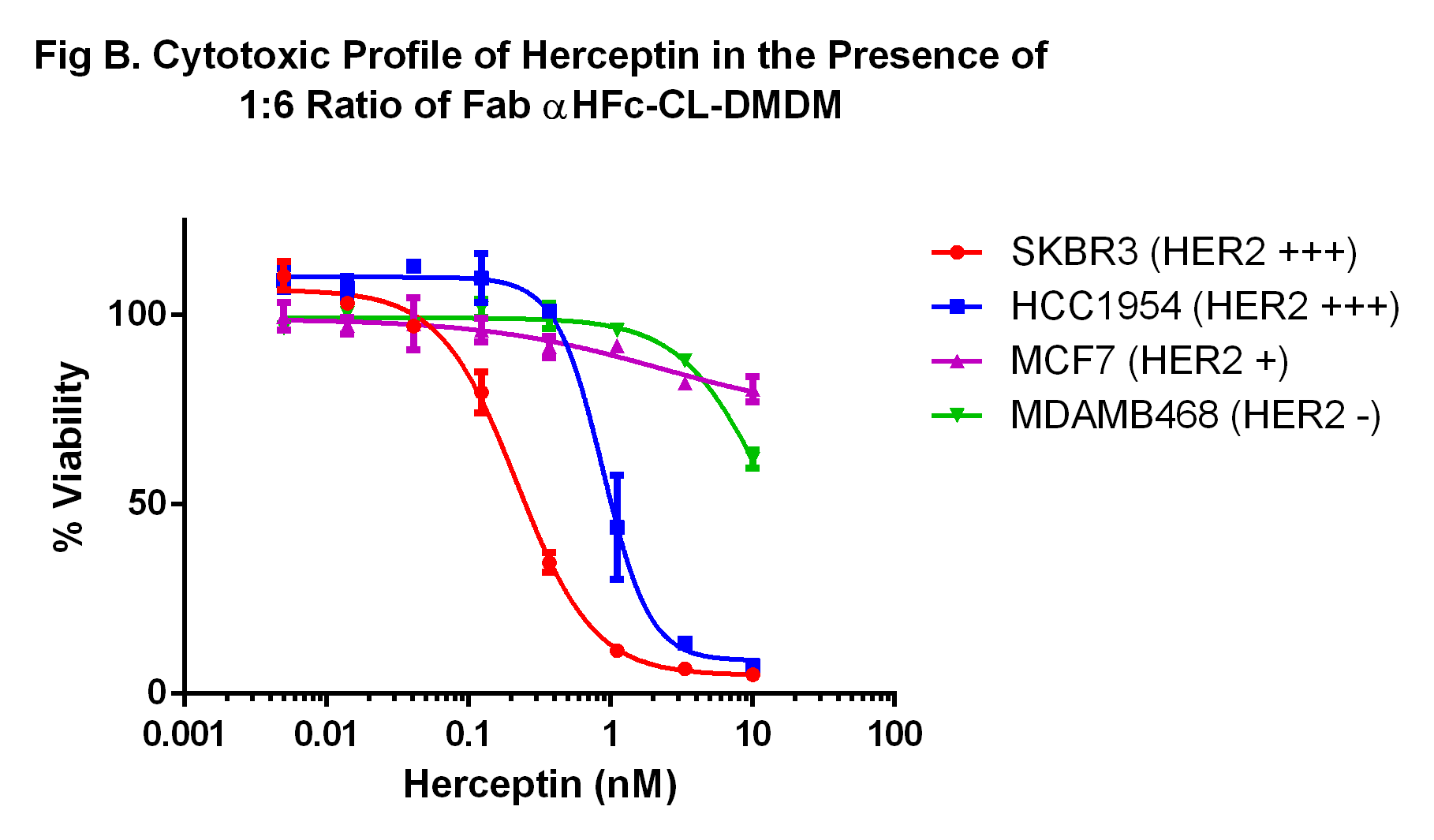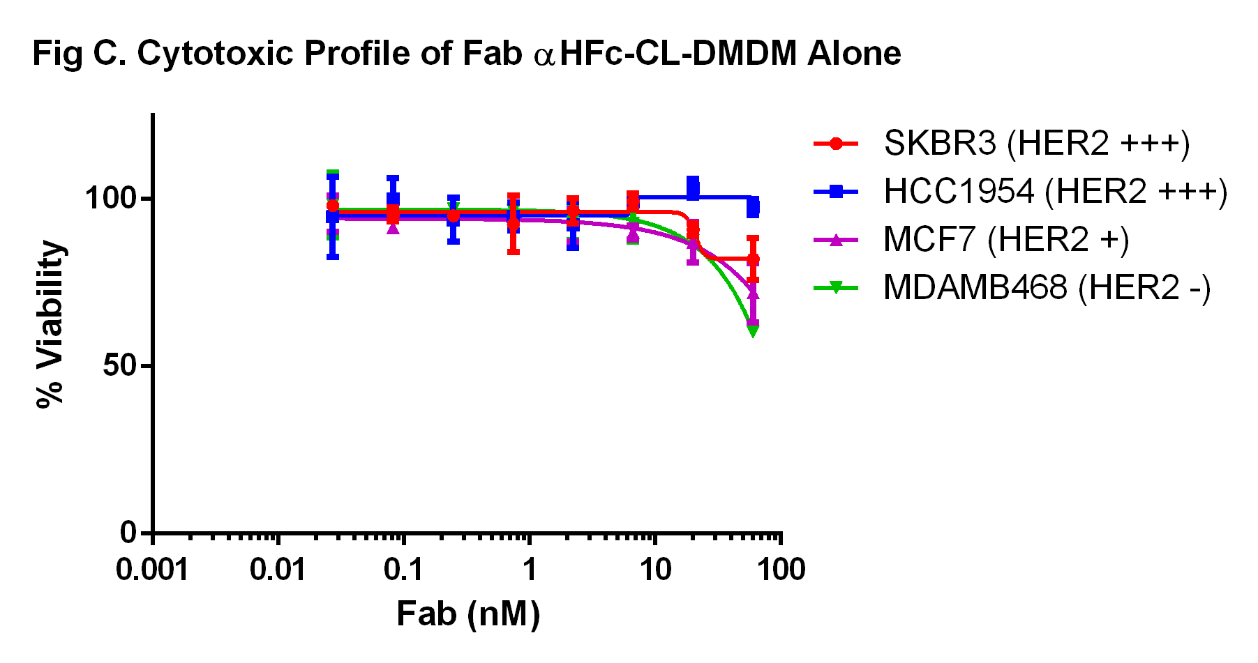 Fab-αHFc-CL-DMDM is a Fab fragment of anti-human IgG Fc specific antibody conjugated to duocarmycin DM (DMDM) with a cleavable linker. The antibody portion is a polyclonal antibody Fab fragment specific to the Fc region of human IgGs. Duocarmycin is a cytotoxic small molecule which causes cell death by binding to the minor groove of DNA and alkylating the adenine. The cleavable linker connecting duocarmycin to the antibody is stable in extracellular fluid, but can be cleaved by cathepsins upon entering cells. The mono-valence nature of Fab 2°ADC may have some advantage in certain applications than the full length IgG 2°ADC.