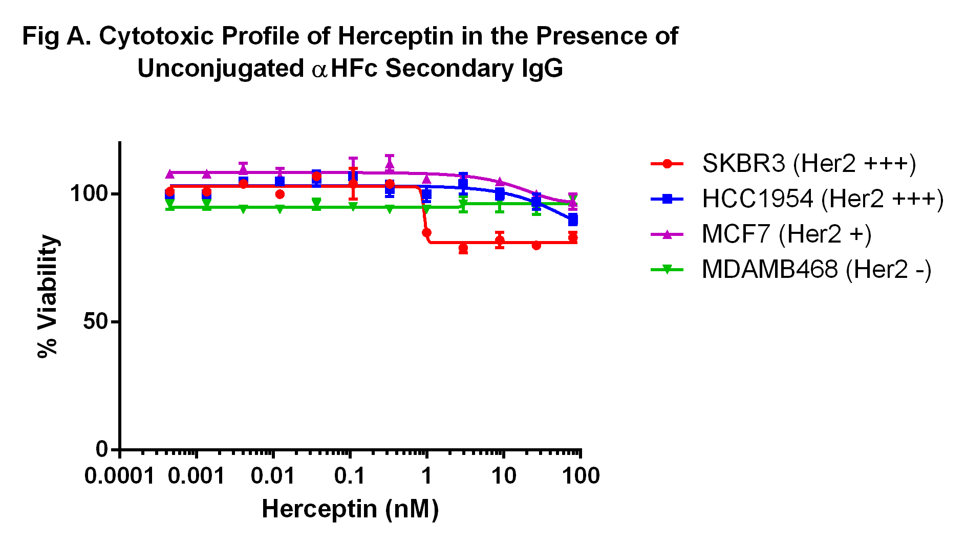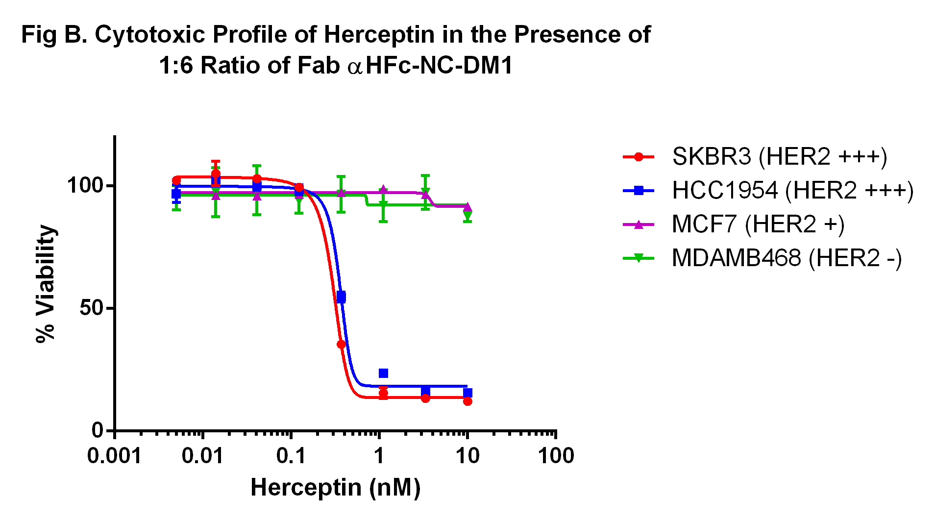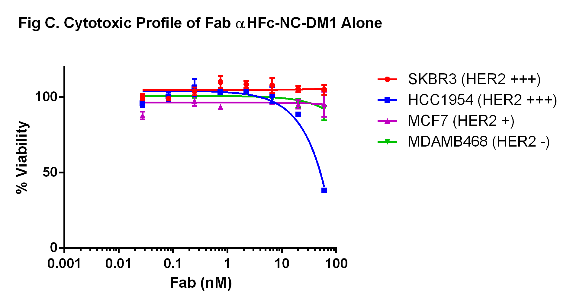 Fab-αHFc-NC-DM1 is a Fab fragment of anti-human IgG Fc specific antibody conjugated to maytansinoid DM1 with a non-cleavable linker. The antibody portion is a polyclonal antibody Fab fragment specific to the Fc region of human IgGs. DM1 is a cytotoxic small molecule which inhibits cell division by blocking the polymerization of tubulin. The non-cleavable linker connecting DM1 to the antibody is stable in extracellular fluid, but can be cleaved by unspecified mechanisms upon entering cells. The mono-valence nature of Fab 2°ADC may have some advantage in certain applications than the full length IgG 2°ADC.