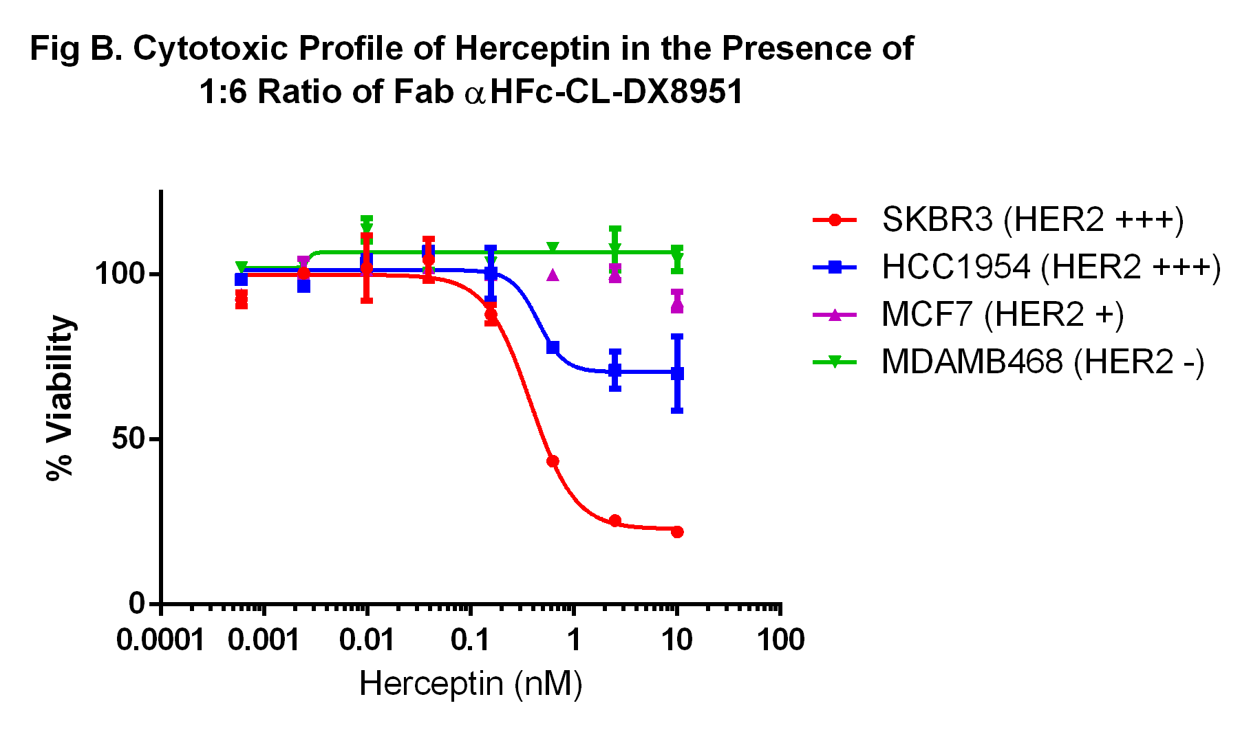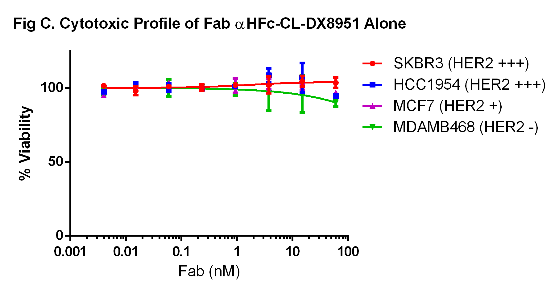 Fab-αHFc-CL-DX8951 is a Fab fragment of anti-human IgG Fc specific antibody conjugated to exatecan mesylate (DX8951) with a cleavable linker. The antibody portion is a polyclonal antibody Fab fragment specific to the Fc region of human IgGs. Exatecan mesylate (DX8951) is a topoisomerase I inhibitor. The cleavable linker (GGFG) connecting DX8951 to the antibody is stable in extracellular fluid, but is cleaved by in endosome once the conjugate has entered a cell via endocytosis.The mono-valence nature of Fab 2°ADC may have some advantage in certain applications than the full length IgG 2°ADC.