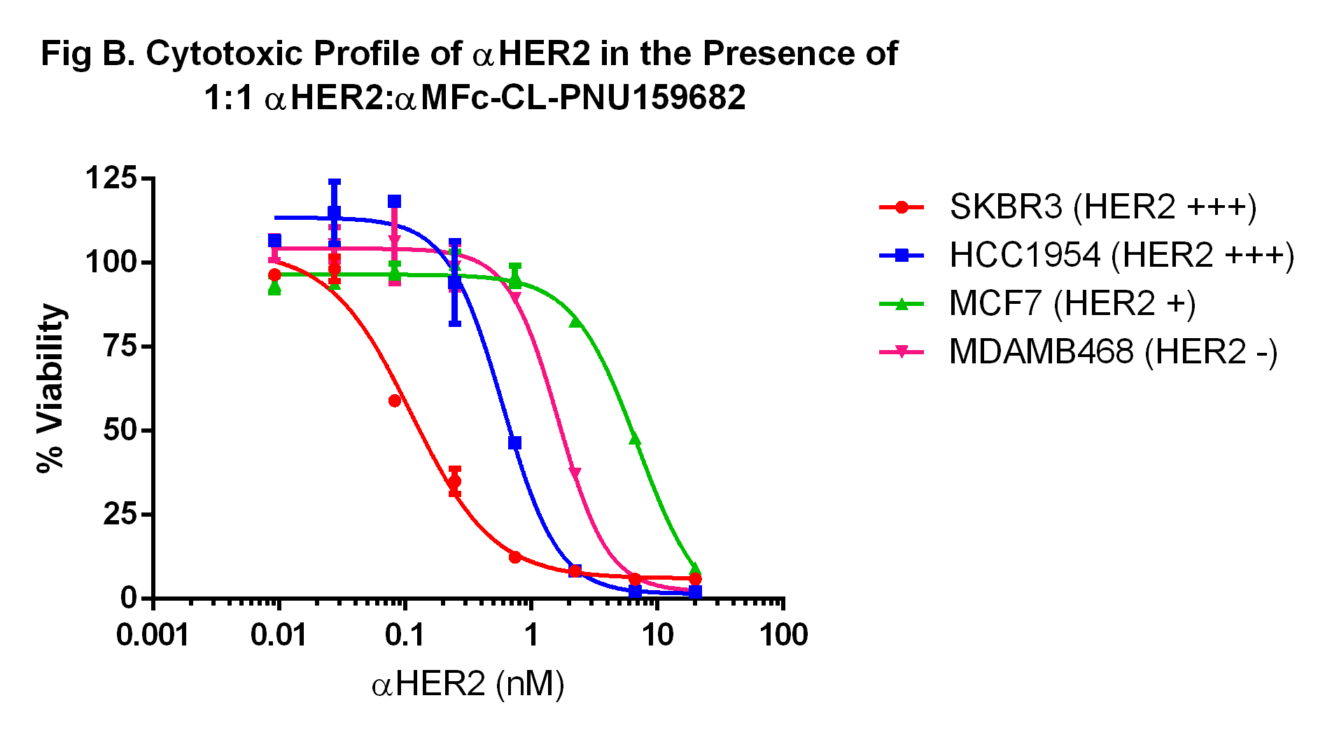 αMFc-CL-PNU is anti-mouse IgG Fc specific antibody conjugated to PNU-159682 with a cleavable linker. The antibody portion is a polyclonal antibody which is specific to the Fc region of mouse IgGs, and it is also cross-reactive to the Fc region of Rat IgGs. PNU-159682, a derivative of nemorubicin, is a cytotoxic small molecule which causes cell death by intercalating DNA and inhibiting replication. The cleavable linker connecting PNU-159682 to the antibody is stable in extracellular fluid, but is cleaved by cathepsin in endosome once the conjugate has entered a cell via endocytosis.