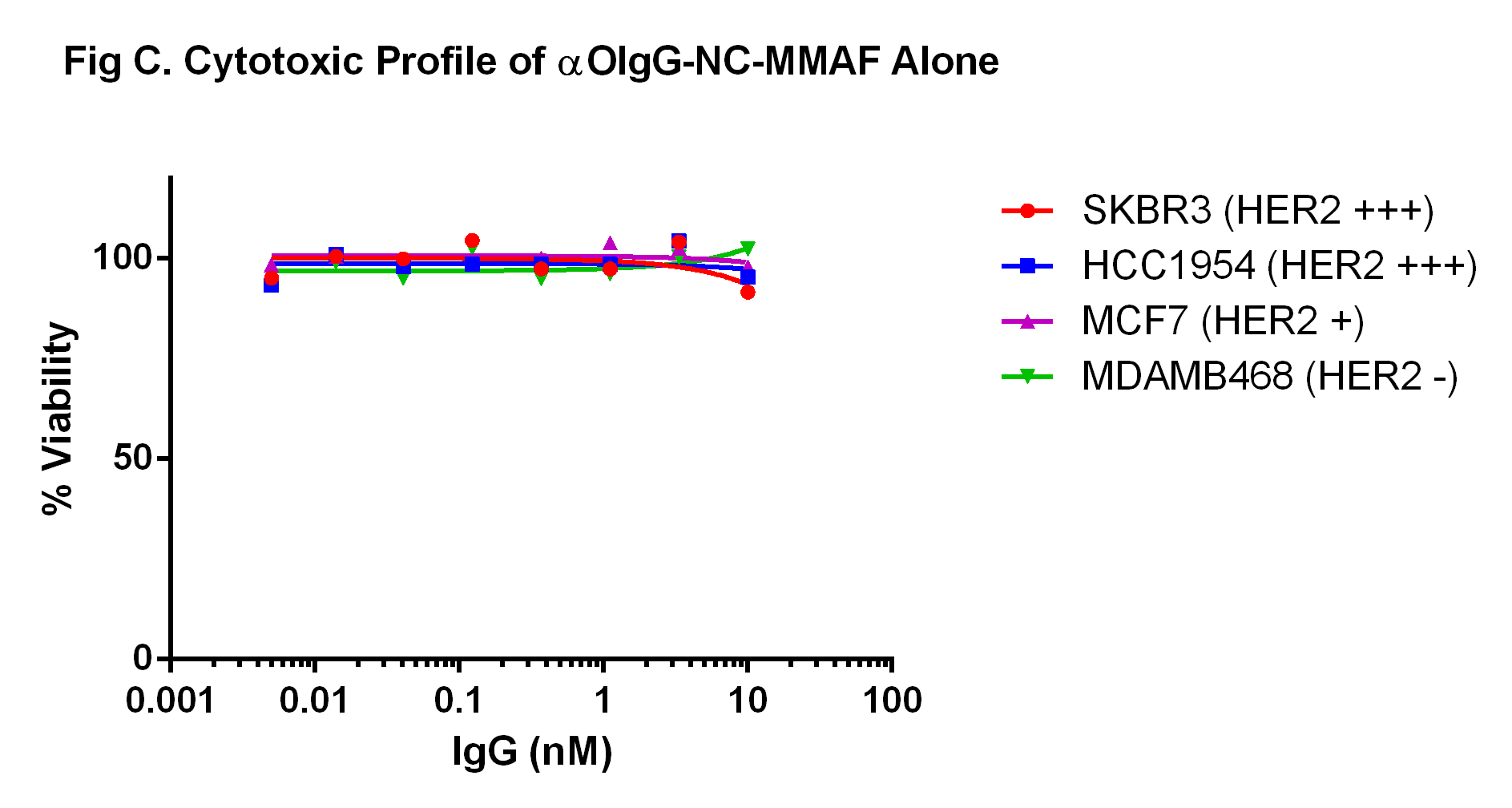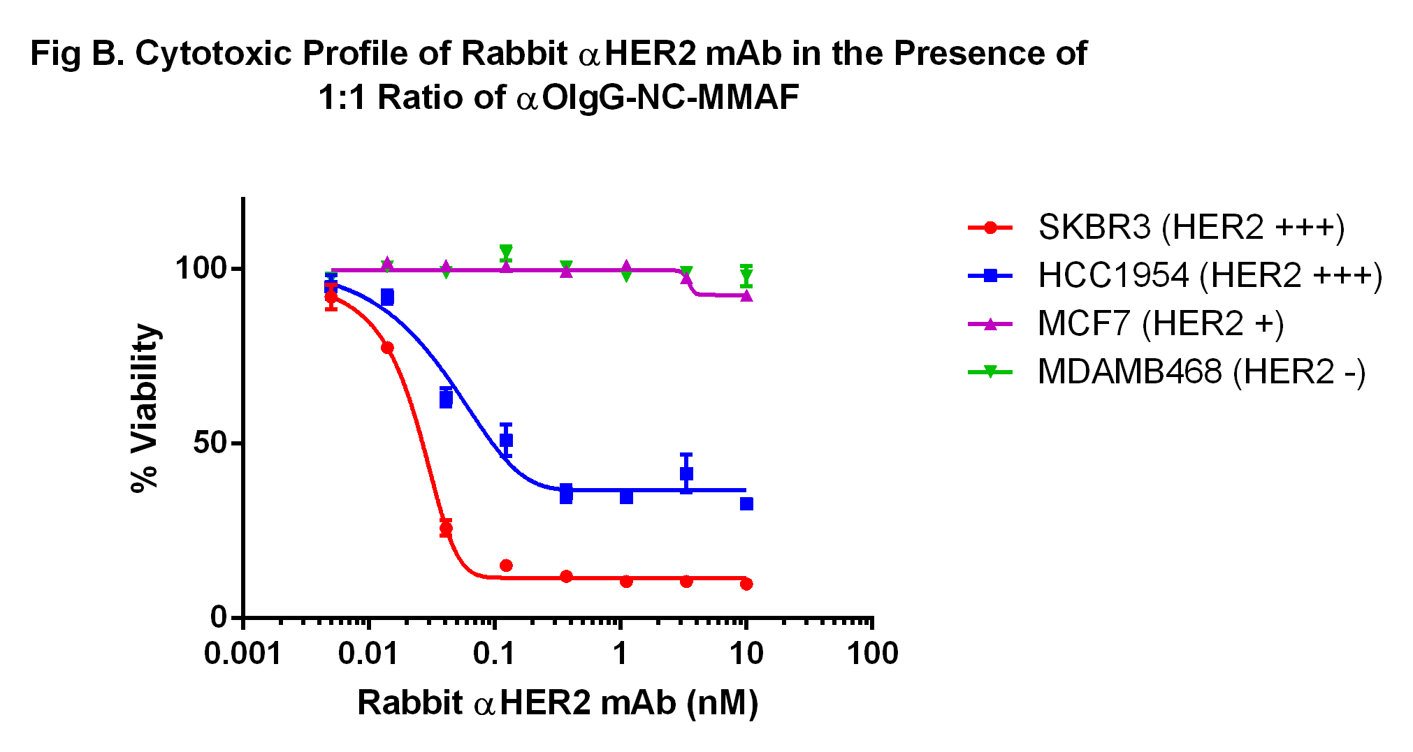 αOIgG-NC-MMAF is an anti-rabbit IgG(H+L) specific antibody conjugated to monomethyl auristatin F (MMAF) with a non-cleavable linker. The antibody portion is a polyclonal antibody specific to both the heavy and light chains of rabbit IgGs. Monomethyl auristatin F (MMAF) is a cytotoxic small molecule which inhibits cell division by blocking the polymerization of tubulin. The non-cleavable linker connecting MMAF to the antibody is stable in extracellular fluid, but can be cleaved by unspecified mechanisms upon entering cells.
