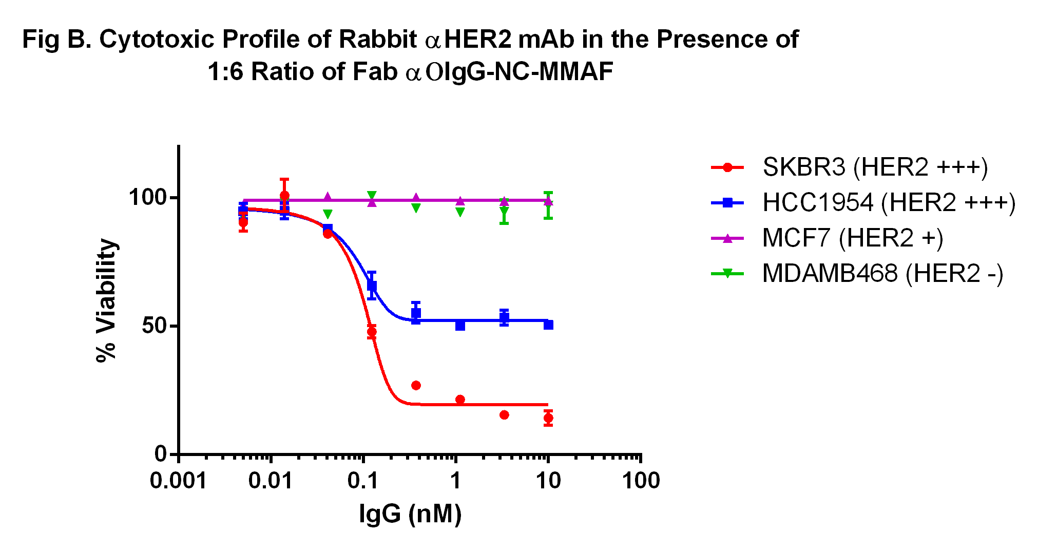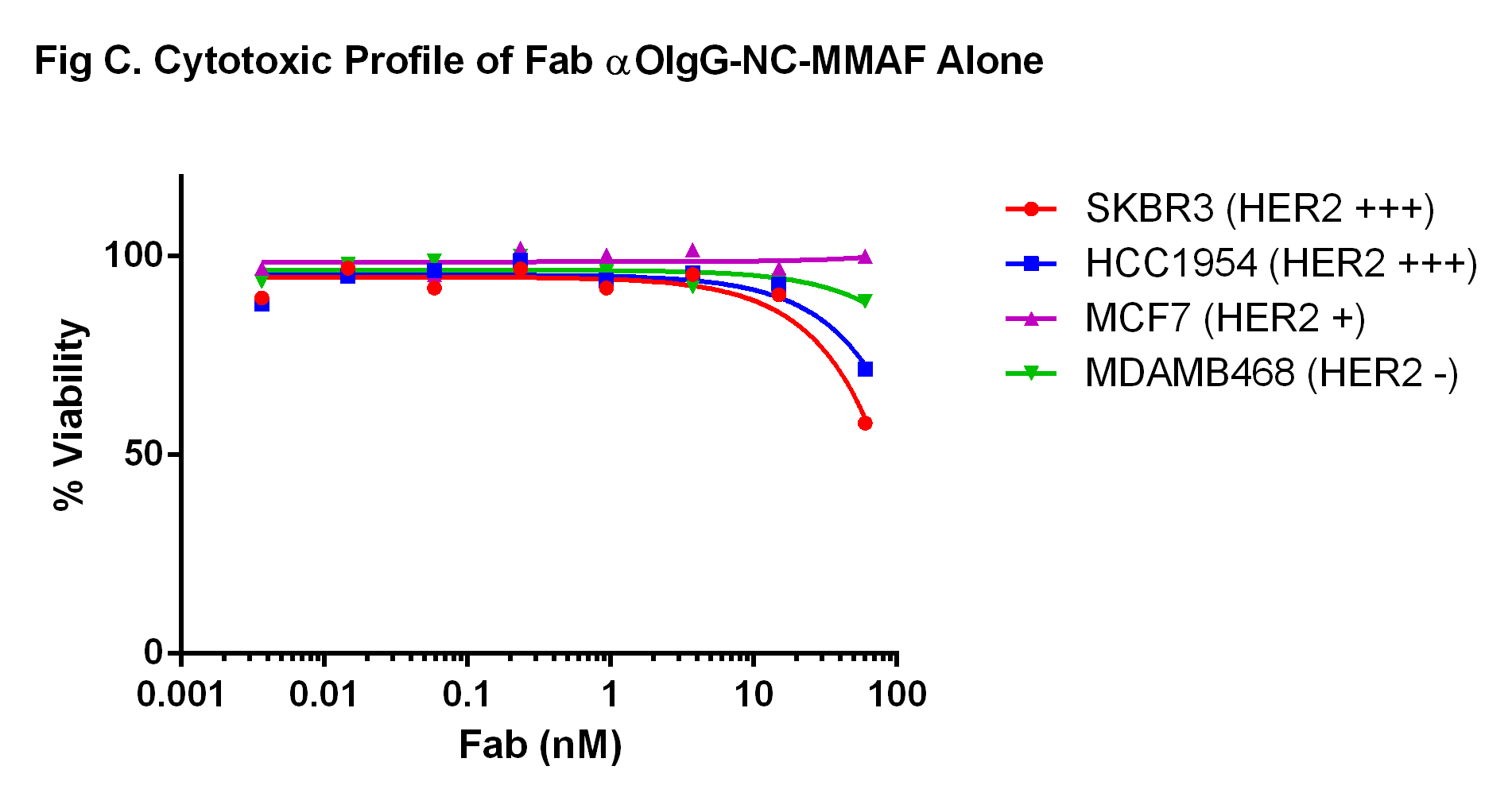 Fab-αOIgG-NC-MMAF is a Fab fragment of an anti-rabbit IgG(H+L) specific antibody conjugated to monomethyl auristatin F (MMAF) with a non-cleavable linker. The antibody portion is a polyclonal antibody Fab fragment specific to both the heavy and light chains of rabbit IgGs. Monomethyl auristatin F (MMAF) is a cytotoxic small molecule which inhibits cell division by blocking the polymerization of tubulin. The non-cleavable linker connecting MMAF to the antibody is stable in extracellular fluid, but can be cleaved by unspecified mechanisms upon entering cells. The mono-valence nature of Fab 2°ADC may have some advantage in certain applications than the full length IgG 2°ADC.