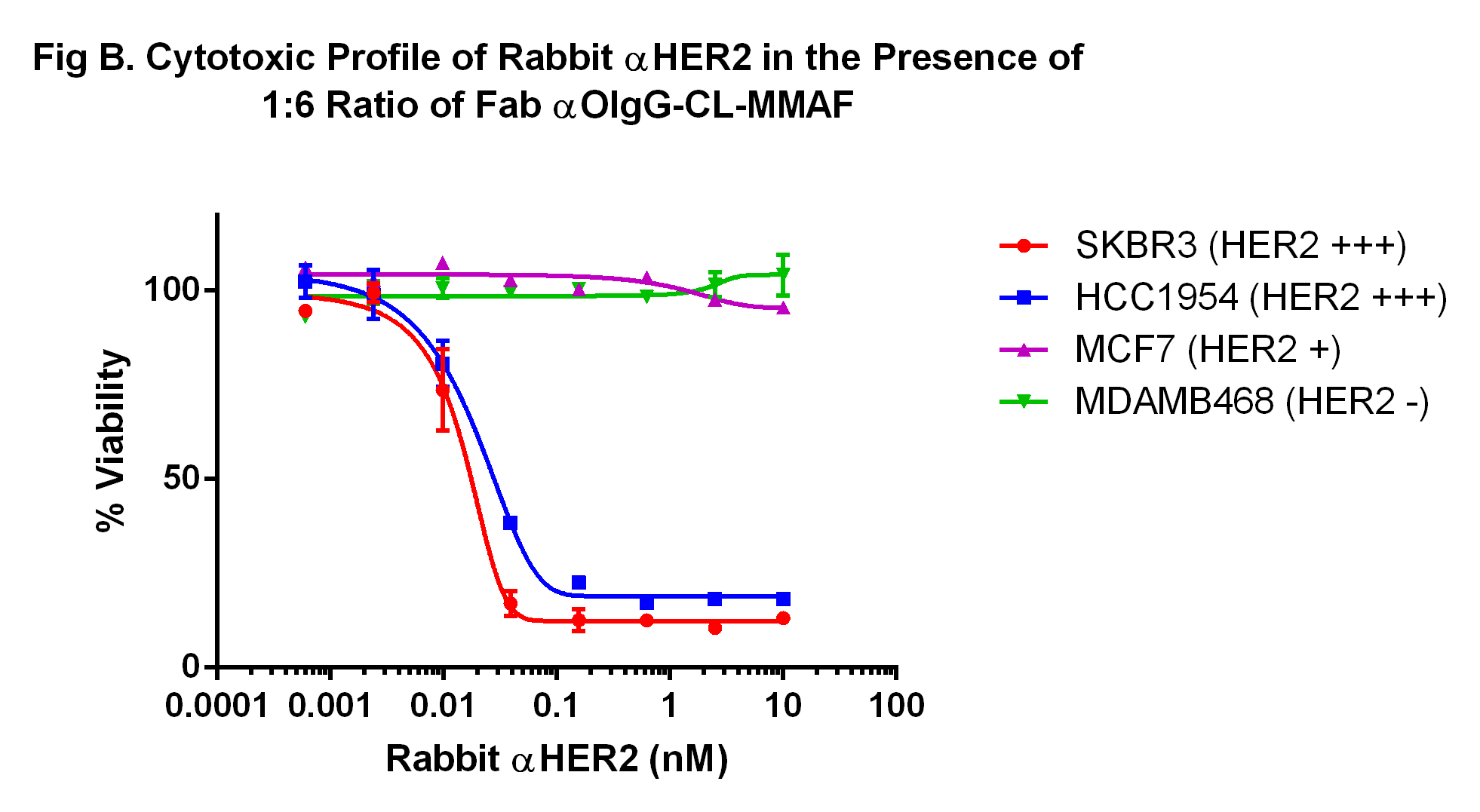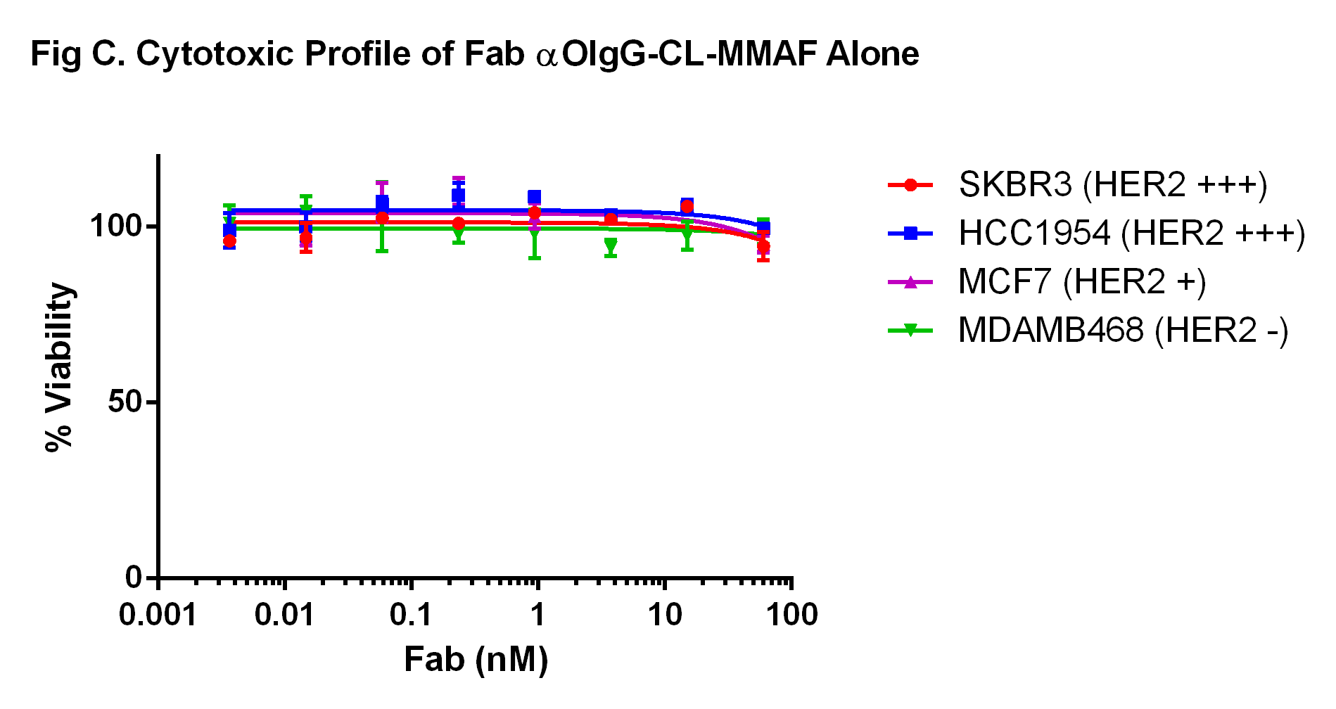 Fab-αOIgG-CL-MMAF is a Fab fragment of an anti-rabbit IgG(H+L) specific antibody conjugated to monomethyl auristatin F (MMAF) with a cleavable linker. The antibody portion is a polyclonal antibody Fab fragment specific to both the heavy and light chains of rabbit IgGs. Monomethyl auristatin F (MMAF) is a cytotoxic small molecule which inhibits cell division by blocking the polymerization of tubulin. The cleavable linker connecting MMAF to the antibody is stable in extracellular fluid, but can be cleaved by cathepsins upon entering cells. The mono-valence nature of Fab 2°ADC may have some advantage in certain applications than the full length IgG 2°ADC.