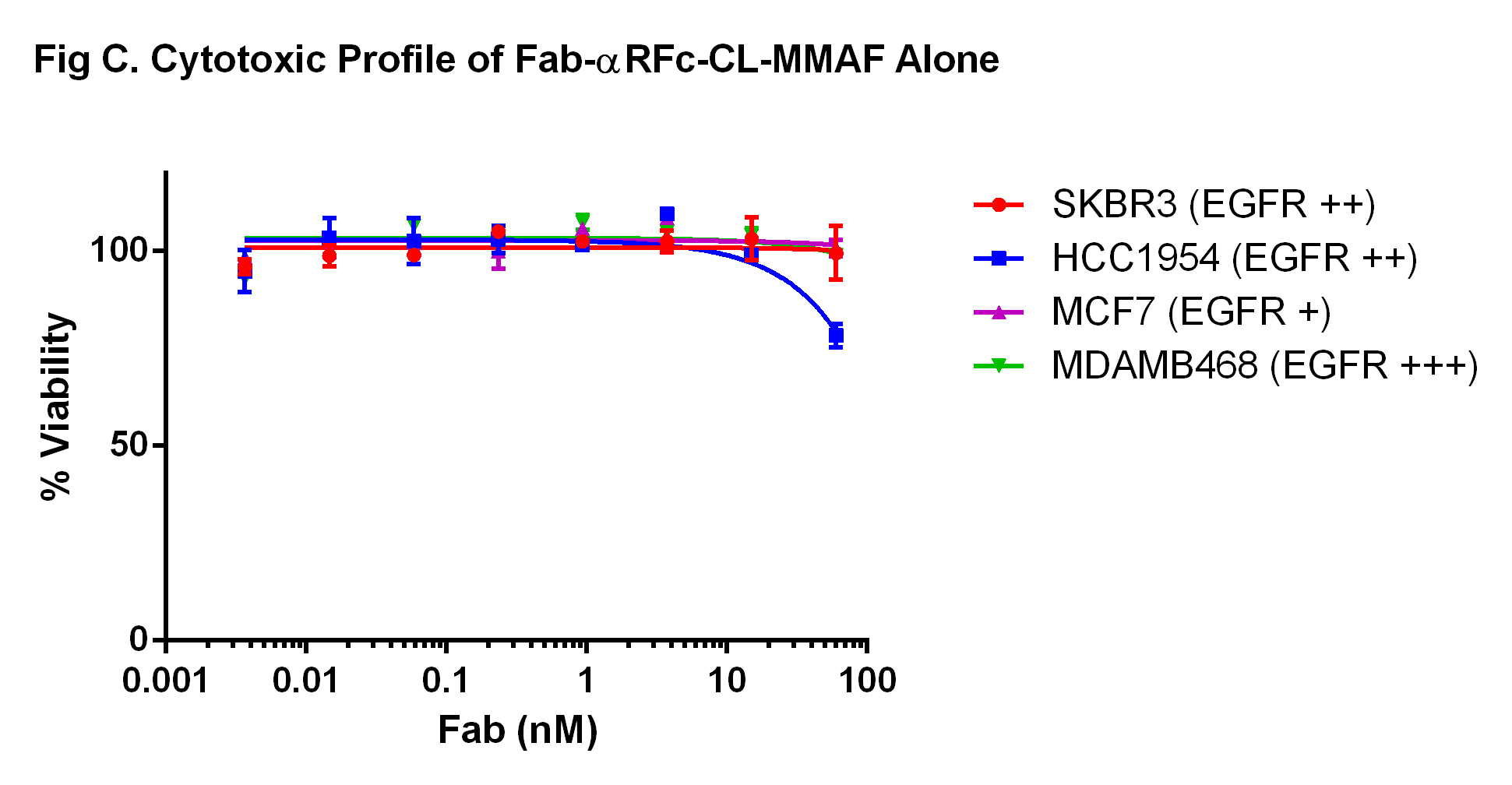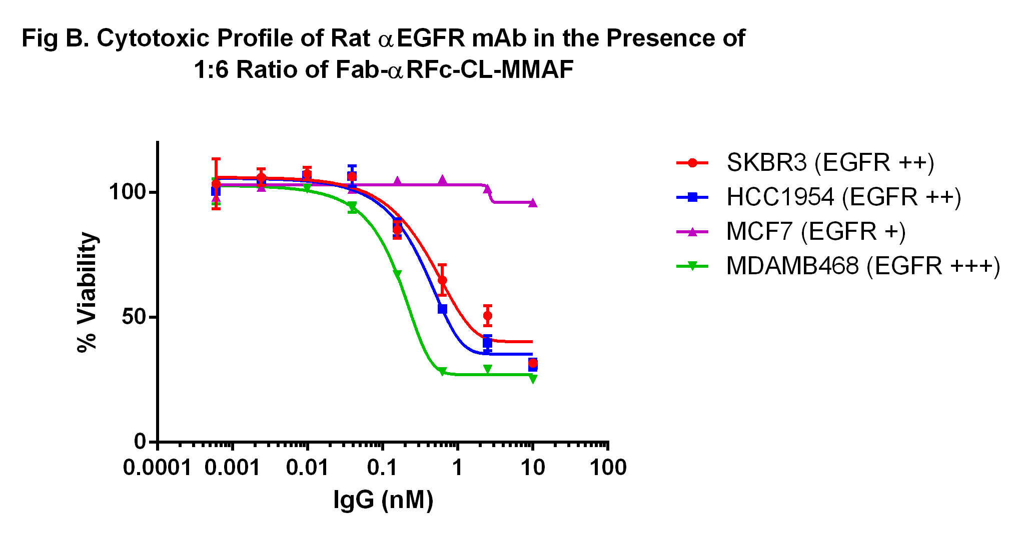 Fab-αRFc-CL-MMAF is a Fab fragment of anti-rat IgG Fc specific antibody conjugated to monomethyl auristatin F (MMAF) with a cleavable linker. The antibody portion is a polyclonal antibody Fab fragment specific to the Fc region of rat IgGs. Monomethyl auristatin F (MMAF) is a cytotoxic small molecule which inhibits cell division by blocking the polymerization of tubulin. The cleavable linker connecting MMAF to the antibody is stable in extracellular fluid, but can be cleaved by cathepsins upon entering cells. The mono-valence nature of Fab 2°ADC may have some advantage in certain applications than the full length IgG 2°ADC.