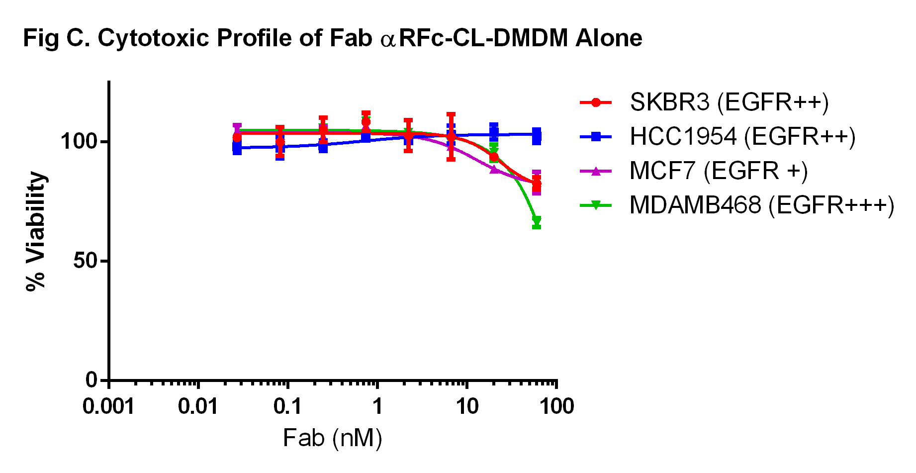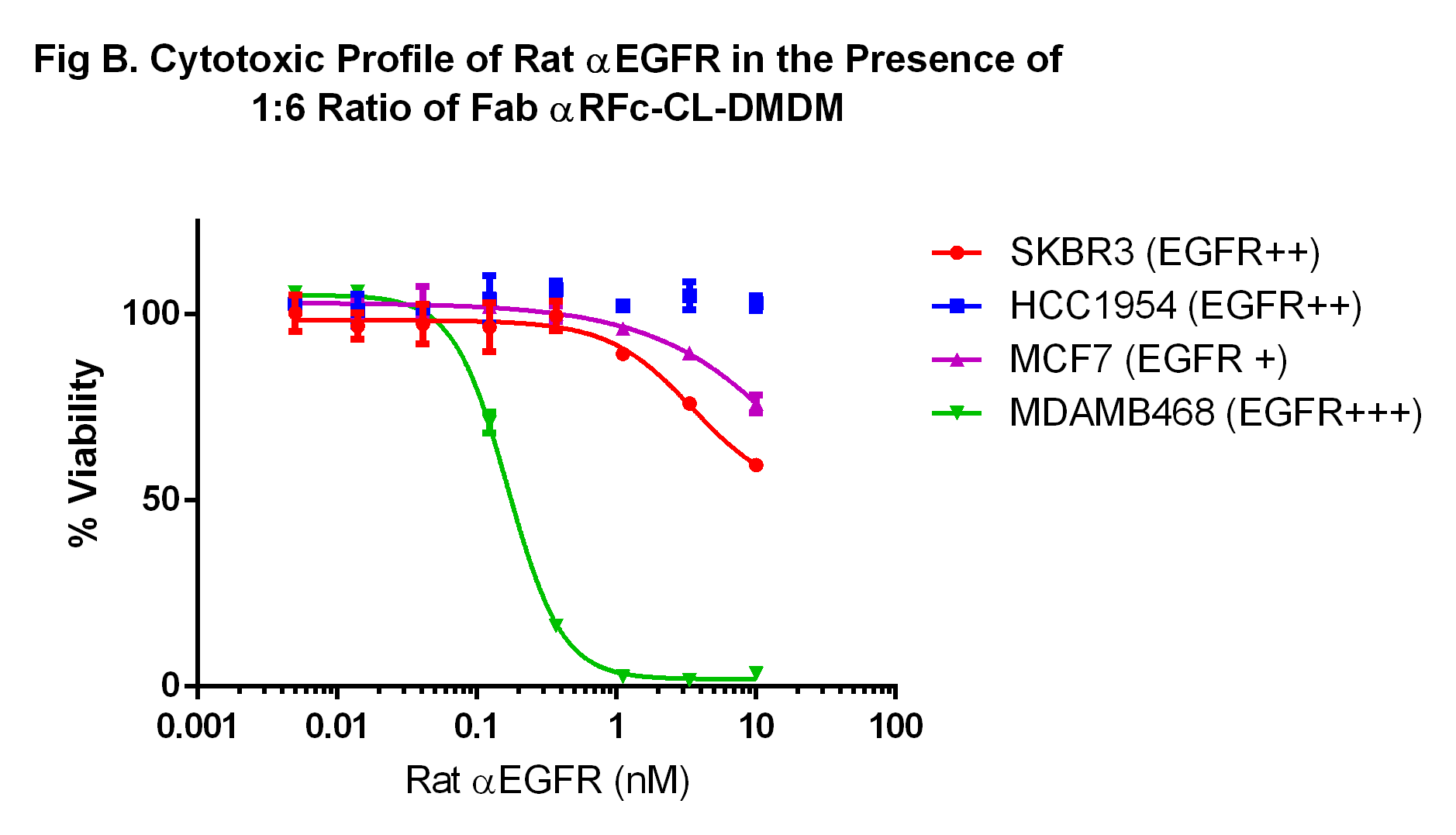 Fab-αRFc-CL-DMDM is a Fab fragment of an anti-rat IgG Fc specific antibody conjugated to duocarmycin DM with a cleavable linker. The antibody portion is a Fab fragment of a polyclonal antibody which is specific to the Fc region of rat IgGs. Duocarmycin is a cytotoxic small molecule which causes cell death by binding to the minor groove of DNA and alkylating the adenine. The cleavable linker connecting duocarmycin to the antibody is stable in extracellular fluid, but can be cleaved by cathepsin upon entering cells. The mono-valence nature of Fab 2°ADC may have some advantage in certain applications than the full length IgG 2°ADC.