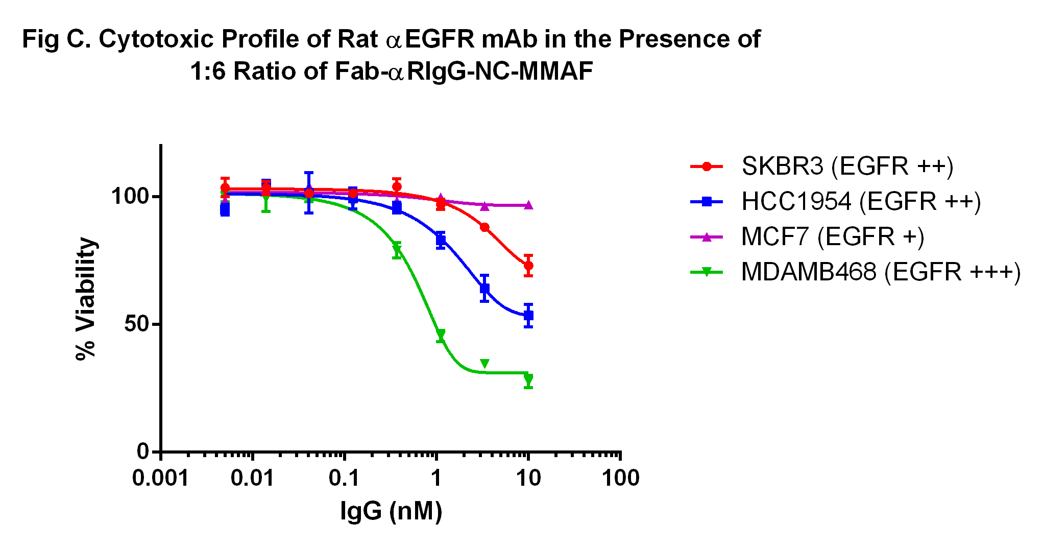 Fab-αRIgG-NC-MMAF is a Fab fragment of an anti-rat IgG(H+L) specific antibody conjugated to monomethyl auristatin F (MMAF) with a non-cleavable linker. The antibody portion is a polyclonal antibody Fab fragment specific to both the heavy and light chains of rat IgGs. Monomethyl auristatin F (MMAF) is a cytotoxic small molecule which inhibits cell division by blocking the polymerization of tubulin. The non-cleavable linker connecting MMAF to the antibody is stable in extracellular fluid, but can be cleaved by unspecified mechanisms upon entering cells. The mono-valence nature of Fab 2°ADC may have some advantage in certain applications than the full length IgG 2°ADC.