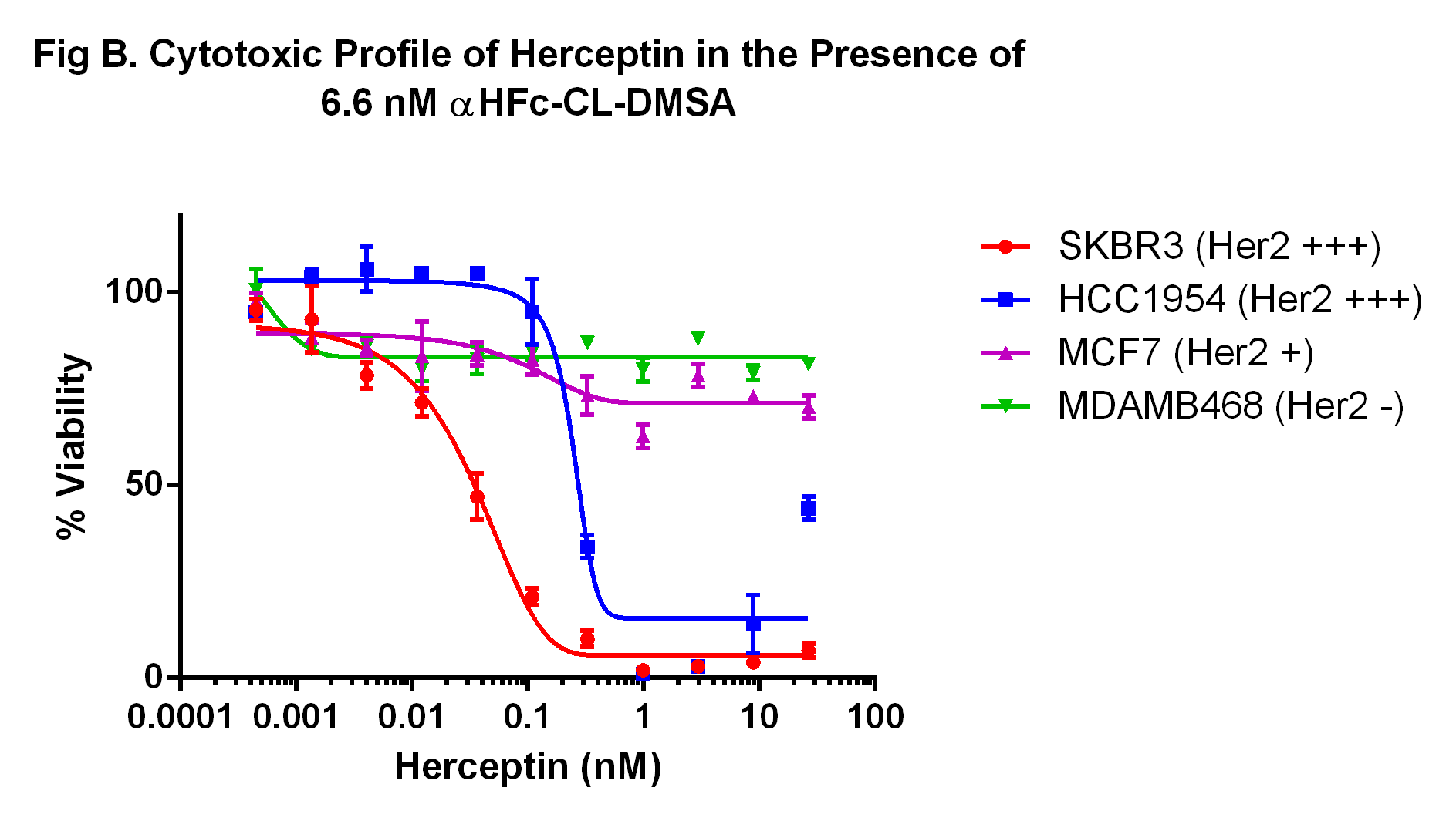 αHFc-CL-DMSA is anti-human IgG Fc specific antibody conjugated to duocarmycin SA (DMSA) with a cleavable linker. The antibody portion is a polyclonal antibody which is specific to the Fc region of human IgGs. Duocarmycin SA (DMSA) is a cytotoxic small molecule which causes cell death by binding to the minor groove of DNA and alkylating the adenine. The cleavable linker connecting DMSA to the antibody is stable in extracellular fluid, but is cleaved by cathepsin in endosome once the conjugate has entered a cell via endocytosis.