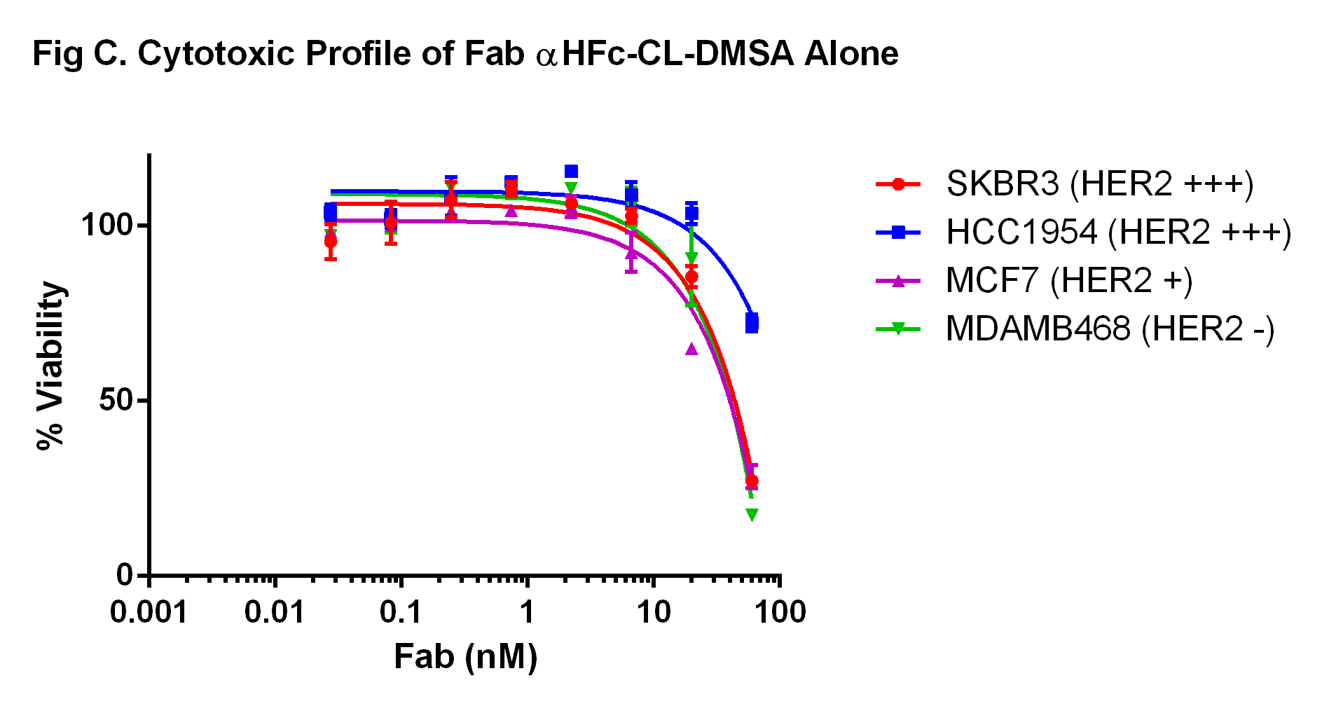 Fab-αHFc-CL-DMSA is a Fab fragment of anti-human IgG Fc specific antibody conjugated to Duocarmycin SA (DMSA) with a cleavable linker. The antibody portion is a polyclonal antibody Fab fragment specific to the Fc region of human IgGs. Duocarmycin SA (DMSA) is a cytotoxic small molecule which causes cell death by binding to the minor groove of DNA and alkylating the adenine. The cleavable linker connecting DMSA to the antibody is stable in extracellular fluid, but can be cleaved by cathepsins upon entering cells. The mono-valence nature of Fab 2°ADC may have some advantage in certain applications than the full length IgG 2°ADC.